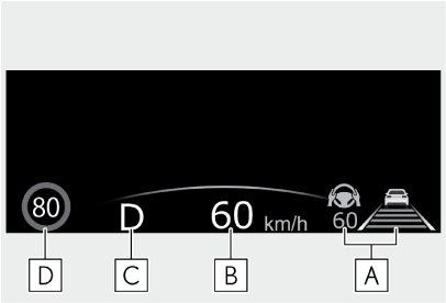 ヘッドアップディスプレイは、フロントウインドウガラスに運転支援システムの作動状況や走行に関するさまざまな情報を表示することができます。表示内容は走行状況・走行モードやヘッドアップディスプレイの表示モードによって異なります。また、状況に応じて割り込み表示されます。