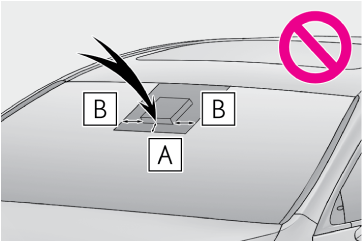 フロントウインドウガラスの前方カメラ前部(図に示す範囲内)にステッカー(透明なものを含む)などを貼り付けない