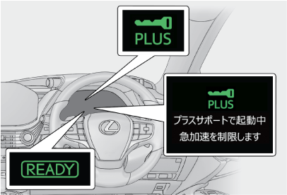 3. “プラスサポートで起動中 急加速を制限します”というメッセージが表示され、プラスサポート表示灯が点灯したことを確認する