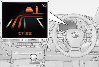 受信した情報は、状況に応じて通知・案内や注意喚起としてマルチインフォメーションディスプレイなどに表示され、運転者に注意を促すことにより安全運転を支援します。