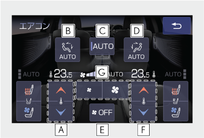 HOME画面で“エアコン”をタッチすると、エアコン操作画面が表示されます。(→リヤマルチオペレーションパネル
