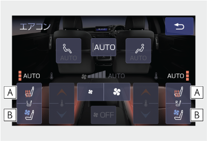 HOME画面で“エアコン”をタッチすると、エアコン操作画面が表示され、リヤシートヒーター/リヤシートベンチレーターを操作できます。(→リヤマルチオペレーションパネル)
