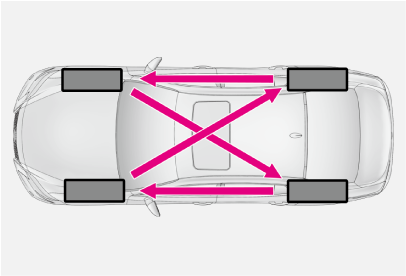 タイヤの摩耗を均等にし寿命をのばすために、タイヤローテーション(タイヤ位置交換)をFR車は10,000kmごとに、AWD車は5,000kmごとに行ってください。