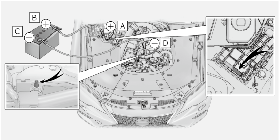 この車の救援用端子は、他の車から応急的に補機バッテリーを充電するためのものです。この救援用端子を使用して、他の車のバッテリーあがりを救援することはできません。