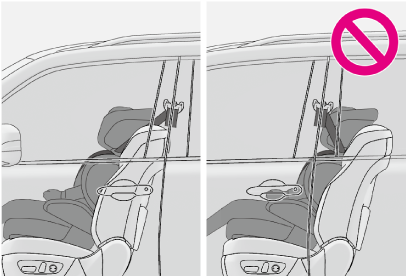 • チャイルドシートに座らせている場合でも、ドア・シート・フロントピラー・サイドピラー・リヤピラー・ルーフサイドレール付近にお子さまの頭や体のどの部分も、もたれかけないようにしてください。SRSエアバッグがふくらんだ場合、大変危険であり、重大な傷害におよぶか、最悪の場合死亡につながるおそれがあります。
