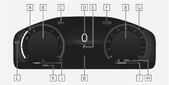 - シフトポジション・ギヤ段表示選択されているシフトポジションまたはギヤ段を表示します。(→オートマチックトランスミッション)