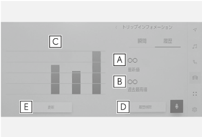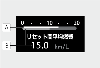 燃費履歴画面で“更新”を選択すると、平均燃費の値とグラフが更新され、新たに平均燃費の記録を開始します。