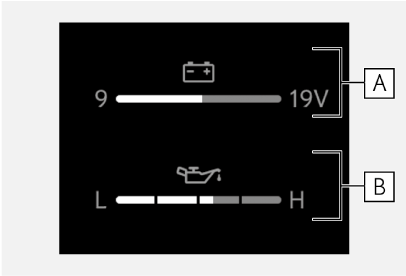 エンジン内部の油圧を表示します。油圧が低下すると、ブザーが鳴り、警告メッセージを表示します。(→油圧警告灯(警告ブザー)
