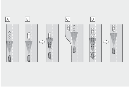 レーダークルーズコントロールは、自車と設定された先行車との車間距離が適正かどうかを判断しており、それ以外の判断はしません。このため、危険性があるかどうかなど運転者は自ら安全の判断をする必要があります。