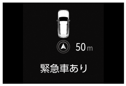 緊急車両(救急車)がサイレンを鳴らして近辺を走行しているときに、ブザーと音声案内により、自車に対する緊急車両のおおよその方向・距離・進行方向を表示します。