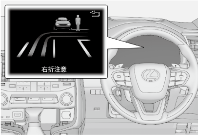 交差点で右側方向指示灯を点滅させて右折待ちをしているときに、対向車や歩行者がいるにもかかわらず発進しようとしているなど、対向車や右折先の歩行者を見落している可能性があるとシステムが判断したときに、ブザーと表示で注意喚起を行います。