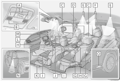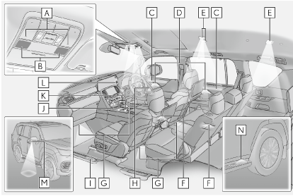 - フロントインテリアランプ・フロントパーソナルランプ(→インテリアランプを操作するには, パーソナルランプを操作するには)
