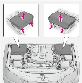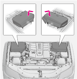 エンジンルームカバーを開けたままにするか、取りはずす前に、エンジンスイッチをOFFにしてください。熱くなった部品でやけどをしたり、作動中の部品に巻き込まれて重大な傷害を受けるおそれがあり危険です。