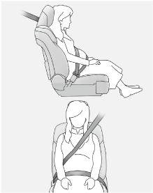 通常の着用のしかたと同じように、腰部ベルトが腰骨のできるだけ低い位置にかかるようにお腹のふくらみの下に、肩部ベルトは確実に肩を通し、お腹のふくらみを避けて胸部にかかるように着用してください。ベルトを正しく着用していないと、衝突したときなどに、母体だけでなく胎児までが重大な傷害を受けたり、最悪の場合死亡につながるおそれがあります。
