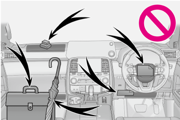 ダッシュボード・ハンドルのパッド部分・インストルメントパネル下部などには何も取り付けたり、置いたりしない