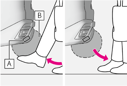 リヤバンパー運転席側の下部に足を近付けて離す動作をし、バックドアから十分に離れることで、バックドアを自動で閉じたあと全ドアを施錠することができます。キックセンサーを使用するときは、パワースイッチがOFF、かつキックセンサーの作動がONで、電子キーを携帯していることを確認してください。