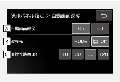 - 一定時間画面操作を行わなかった場合、自動で画面が切りかわるかを設定できます。