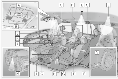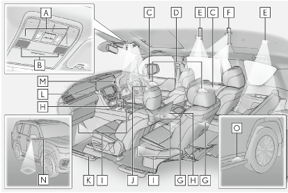- フロントインテリアランプ・フロントパーソナルランプ(→インテリアランプを操作するには, パーソナルランプを操作するには)