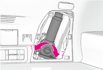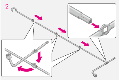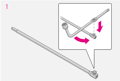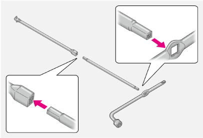 ジャッキハンドルが不意に分解しないように、ジャッキハンドルを組み付けたあと、ホイールナットレンチの穴部を使いネジ部を確実に締め付けてください。