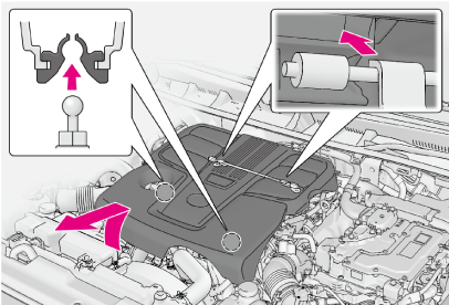 - ボンネットを開けて(→ボンネット)、エンジンルームカバーを取りはずす(→エンジンルームカバーを取りはずすには)