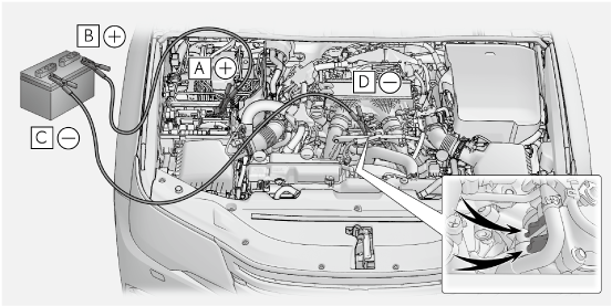 指定の端子および接続箇所以外にブースターケーブルを接続しないでください。電子機器に悪影響をおよぼしたり、破損につながったりするおそれがあります。