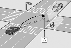 DSSS用路側装置が設置された交差点であっても、DSSS用路側装置の種類や交差点に進入する方向によっては、対向車のみを検知し、歩行者に対する注意喚起をしない場合があります。