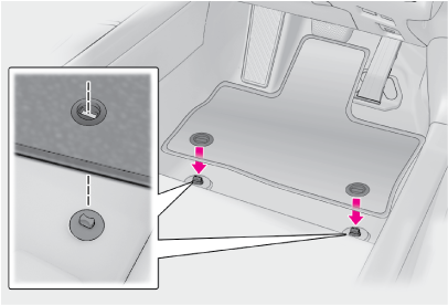 フロアマットがすべての固定フック(クリップ)で正しい位置にしっかりと固定されていることを定期的に確認し、特に洗車後は必ず確認を行う