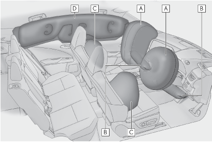 次のSRSエアバッグは、側面や後方からの衝撃・横転・または低速での前方からの衝撃では、通常は作動しません。ただし、それらの衝撃が前方への減速を十分に引き起こす場合には、作動することがあります。