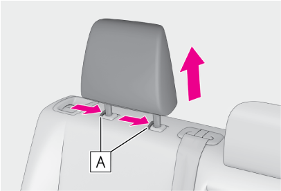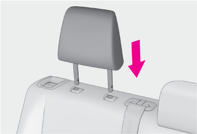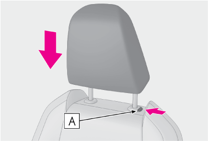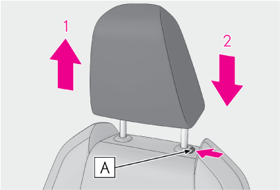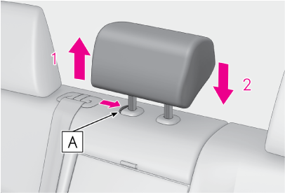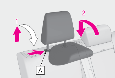 を押しながらヘッドレストを引き上げ、前方へ倒します。 - 使用するヘッドレストを起こしロック位置まで押し下げる