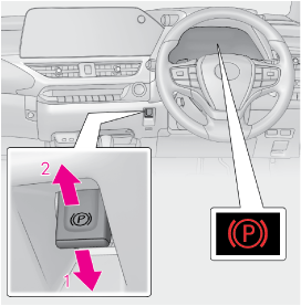 パーキングブレーキスイッチを操作してください。何度か操作しても表示が消えない場合は、システムに異常があるおそれがあります。レクサス販売店で点検を受けてください。