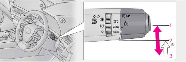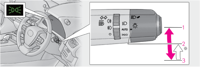 2 | デイタイムランニングランプ(→デイタイムランニングランプ)が点灯 | ヘッドランプ・スモールランプが点灯 |