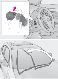 ウォッシャー液を出すレバーを手前に引くとワイパーと連動してウォッシャーが作動します。(数回作動したあと、液だれ防止としてさらに1回作動します。ただし、走行中は液だれ防止作動は働きません。)ヘッドランプクリーナー装着車:
