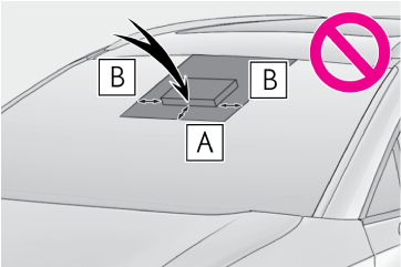 • フロントウインドウガラスの前方カメラ前部(図に示す範囲内)にステッカー(透明なものを含む)などを貼り付けない
