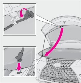 ボンネットステーをステー穴から取りはずし、クリップに正しくもどしてください。